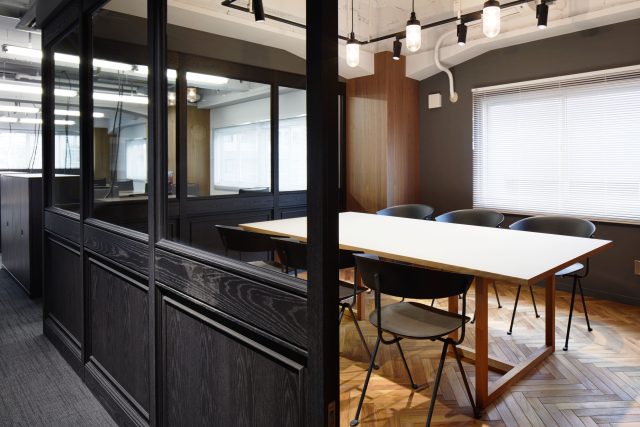 当社無垢フローリング(チークヘリンボーン)・複合フローリング(床暖ウォールナット)を採用したオフィス事例。