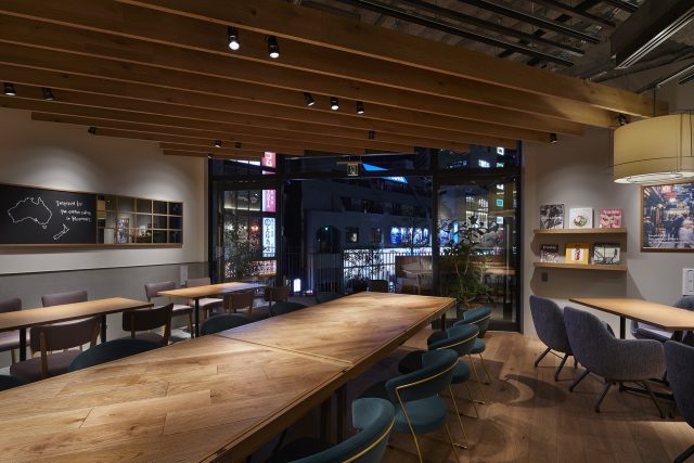天井や壁には、同じく当社ナラの不燃突板を採用することで、飲食店で求められる『内装制限』に対応した仕様となっています。