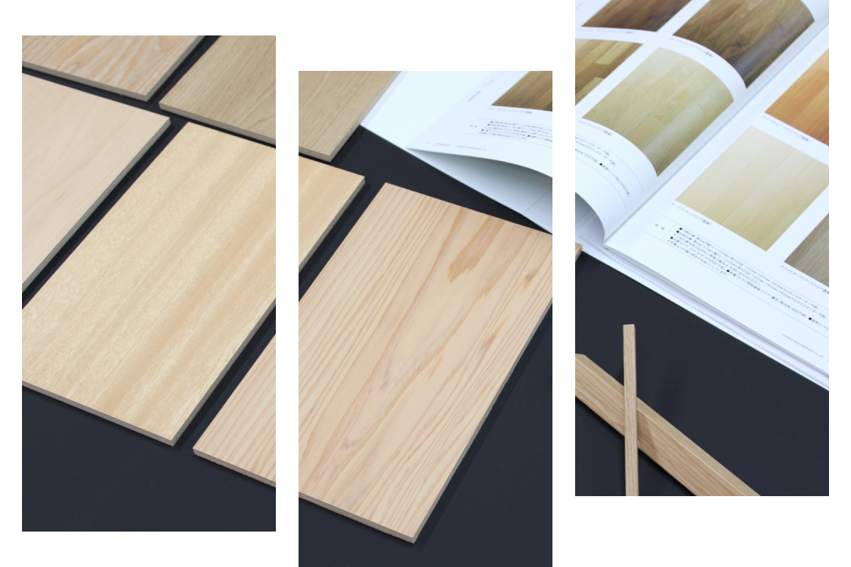 当社では、フローリングにはクリア塗装・着色塗装・特注色塗装など、ご要望に合わせた仕上げをご提案いたします。また、不燃突板についても、内装デザインに合わせてサイズ調整や塗装・加工が可能です。